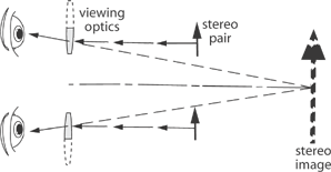 A small instrument containing a picture support and a pair of magnifying lenses so arranged that the left eye sees only the picture taken with the left lens of the stereo camera, and the right eye only the right picture. If the camera lenses are separated by the interocular distance, and if the focal lengths of camera and stereoscope lenses are equal, then a true-to-scale or orthoscopic reproduction of the scene is obtained. Stereoscopes are used extensively in photogrammetry.