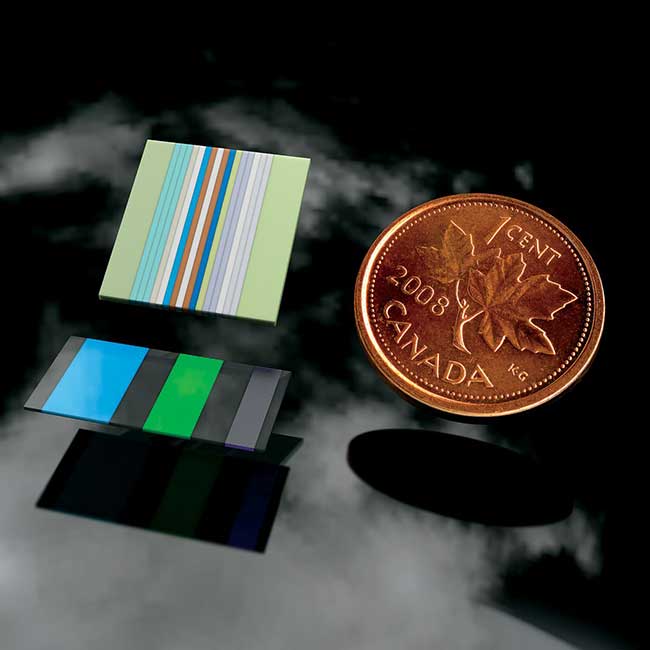 The ability to offer spatially varying spectral performance on a single element can have many advantages in optical systems used for Earth Observation (EO) remote sensing or multi-spectral imaging. Iridian offers customized multizone filter (MZF) arrays using both multi-element assemblies (“butcher-block” approach) and patterned arrays to address growing needs for this functionality anywhere in the wavelength range from the UV (300nm) to LWIR (10um).