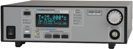 The 5400 Series TECSource High-Power Temperature Controllers bring TEC power to a whole new level! With up to 960 Watts of TEC power, the 5400 powers even the most power-hungry applications. Capabilities including multiple simultaneous sensor inputs, digital I/O, and an analog output further extend the power of this new instrument. Housed in a compact enclosure with simple controls and bright VFD display, the 5400 will satisfy your demanding requirements.