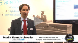 Martin Hermatschweiler, CEO, of Nanoscribe GmbH describes their new product, the Photonic Professional GT, which is the highest resolution and fastest 3-D printer on the market. Nanoscribe won the Prism Award for the Advanced Manufacturing Category.