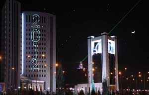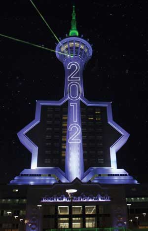 On New Year’s Eve 2011, the people of Ashgabat, Turkmenistan, celebrated the launch of not just 2012 but a citywide laser installation. A laser projected “2011” on the capital city’s 175-m-high Anayasa tower and then counted down the seconds until the New Year arrived. At just the right moment, the laser projection changed to read “2012.” As the fireworks went off, both the New Year and the Ashgabat Towers Project took off. The project is an immense permanent laser display that connects the city’s towers with shining beams of green, the national color of Turkmenistan. LOBO electronic GmbH of Aalen, Germany, which has supplied laser show and multimedia systems for more than 25 years, partnered with Turkish construction company Polimeks to create the spectacle. Spanning a total distance of almost 30 km between all the towers in an extremely bright environment was a formidable challenge for the engineers, the German company said. Automation and daily operation of the elaborate system required different approaches. The display automatically lights up every evening at 7 o’clock and dims at 3 a.m. All beams were designed bidirectionally to provide the best visibility. LOBO’s ultrabright “sparks” series lasers form the basis of the project, and its Lacon-5 platform handles the automation; integrated global positioning system modules synchronize the laser systems. Coherent Inc.’s Verdi lasers are incorporated into the display as well. “Superlative beam quality was a key criterion at this project,” said Alexander Hennig, LOBO’s creative director. The company designed special optics for the installation to guarantee optimal light density over long distances, he added. The much-needed high brightness was accomplished partly through the use of LOBO’s 10-km-long laser test track. As part of a New Year’s Eve celebration, an extensive laser light display connecting the city’s towering structures and monuments was launched in Ashgabat, the capital of Turkmenistan. Courtesy of LOBO Laser and Multimedia Systems. Officials of the International Laser Display Association believe that the Ashgabat project is the largest permanent display laser installation in the world, according to LOBO; the association recently accredited LOBO as a professional laser show company.