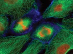 PtK1 epithelial cells labeled for microtubules (green), actin (blue) and DNA (red/orange). Collected with a wide-field fluorescence microscope at 400x. Courtesy of Dr. Jennifer Waters, Nikon Imaging Center at Harvard Medical School.