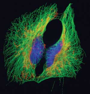 BSC1 epithelial cells labeled for microtubules (green), mitochondria (red/orange) and DNA (blue). Collected with a wide-field fluorescence microscope at 600x. Courtesy of Dr. Jennifer Waters, Nikon Imaging Center at Harvard Medical School.
