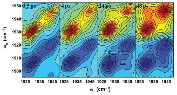 Figure 6. Two-dimensional IR spectra show CO during conformational changes in myoglobin over time. Courtesy of Accounts of Chemical Research.