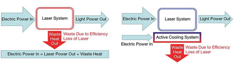Figure 2. Below: In passive cooling designs (left), the laser heat increases until the equation is satisfied. In active cooling designs (right), the laser temperature is controlled. Courtesy of Aspen Systems LLC.