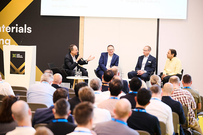 Industry executives Thomas Fehn of TRUMPF (second from left), Sanjai Parthasarathi of Coherent (right), and Trevor Ness of IPG Photonics (second from right) participate in a panel discussion moderated by Andreas Thoss. Courtesy of the Laser Marketplace forum at LASER Munich, Messe München.