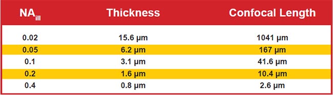 For the most common and easily generated light sheet type — Gaussian — the thinness and length are both controlled by a single parameter, NAill, as shown in Figure 4. In practice, the sheet length is usually chosen to match the size of the specimen (or the detection objective’s field of view), which fixes the sheet thinness. Figure 5 gives exemplary values for sheet thinness and corresponding lengths for Gaussian sheets.