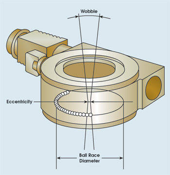 Precision assembly solutions are as unique as the products they are built to automate, especially in the photonics world. Progressive assembly operations such as guiding, gluing and bonding sometimes take place in a local region around a static package in three-dimensional space. Integrating the different mechanical systems so that all of the active components are available within that small space is a challenge. To determine system capability for photonic applications, it helps to understand the types of errors associated with the mechanical system and the techniques that can help minimize them. This should be second nature to all parties involved, including the mechanical and control engineers on the integration side and the designers of the product. Axis-specific errors First, consider linear errors. Resolution is the minimum distance measured by a closed-loop feedback system. This is the resolution of the system, and it does not imply the ability to actually move that distance. Also important is minimum bidirectional step size, or the smallest repeatable step size a system can achieve. The bidirectional nature is important because mechanical errors and stiction are taken into consideration. Next, examine position repeatability, which is the ability of a system to return repeatedly to a given point in space. Also evaluate the system’s linear accuracy. Derived from repeatability and resolution, this is the difference between the actual position and the desired position along a line, compared with an absolute reference. Companies usually specify stage accuracy, for example, as a percentage of full stroke. In this spatial axis-specific error category, flatness and straightness specify the path deviation from the best-fit straight line along the axis of motion of a stage. Flatness is the vertical runout, and straightness is the horizontal runout. However, factory specifications assume that the stage mounts to a lapped surface, which is often not feasible for every stage in a system. Figure 1. When designing positioning systems for photonic component manufacturing and assembly, it helps to understand potential error involved. Wobble, for instance, is the angular deviation of the axis over one revolution. Eccentricity is the translation of the center over one revolution. For rotary stages, eccentricity, the deviation of the center over one revolution, and wobble, the angular deviation of the axis over one revolution, are key (Figure 1). System-specific errors The process of stacking components basically combines axes to form a positioning system, with each stage spatially related to and dependent on the previous stage. Also of note are Abbe errors, linear errors caused by underlying angular errors. Small angular errors along the stage axis produce translation errors at the work surface, and the farther the work area is from the stage, the larger the linear error (Figure 2). Figure 2. Small angular errors at the stage surface produce translation errors at the work surface. The Abbe error (dx) equals the angle (u) times the offset (h). Orthogonality error should be added to the designer’s checklist. This is the degree of perpendicularity error between two axes in a plane. Over its travel, a pair of axes for a high-quality, factory-assembled system with a range of motion of 200 x 200 mm can translate to 10 μm in X and Y because of such errors. Now examine the position, path and placement accuracy that the system will require: • Position accuracy is the difference between the actual location and the desired location, compared with an absolute reference (Figure 3). • Path accuracy pertains to a mechanism in motion and its deviation in position from a planned path. Precision dispensing of an epoxy ring is an example of where this would be required. • Placement accuracy usually means the result of placing one object in some orientation relative to another with a degree of certainty. While loosely based on the mechanical precision of a system, this specification is really the outcome of the hardware, the software and calibration working together to perform an operation. Figure 3. These figures represent two-dimensional position repeatability and accuracy of a tool tip relative to a target point; for example, (0,0) at the intersection of the X- and Y-axes. All of these errors are compounded by the thermal expansion of each axis, by tooling plates and by machine bases due to ambient temperature and duty-cycle variations. Systems also can experience substantial errors when stages bearing a load are cantilevered. When stages are stacked, the total error will differ at each location within a work envelope. Also review the coordinate system that is used to identify positioning in 3-D space. The native coordinate system for most platforms is the Cartesian (Figure 4). In some assembly applications, however, maneuvering around the center of a gripped object is necessary. This center point is sometimes referred to as the virtual pivot point. By defining a tool coordinate system and using a motion control code to facilitate it, the object can be rotated without translating in X, Y or Z, as well as translated in X, Y or Z without rotating. Figure 4. The Cartesian coordinate system provides a framework to define a location in six degrees of space relative to a datum (0,0,0,0,0,0). This technique will require spatially relating the tool tip, which is attached to the tooling surface (on the Rz axis), to the mechanism’s Cartesian coordinate system (Figure 5). Using real-world units in one common reference frame, the six degrees of space position and orientation of each link must be described. And describing how each axis couples with and relates to the prior axis in the stack is necessary to accurately define the tool-tip location. Each link is represented as a vector, and multiple vectors are related to define a manipulator. Figure 5. The tool coordinate system helps define a location in six degrees 