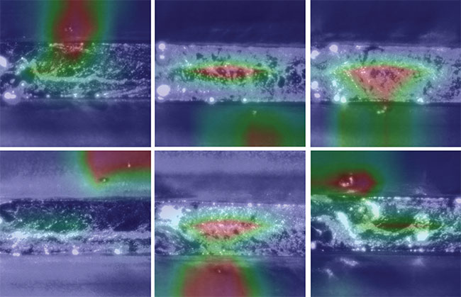 Figure 4. Regions of interest were mapped on test samples by an AI system trained to detect the presence of pores and spatters — two critical measures of the quality of industrial brazing processes. The system identifies images that contain pores or spatters, without identifying the pores or spatters themselves. Three columns of images show pores (top), and three show spatters (bottom). Courtesy of Scansonic MI.