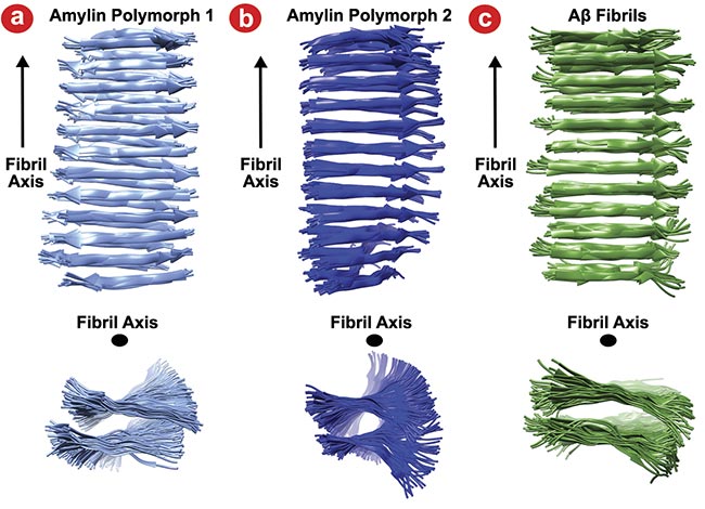 Studies using ssNMR and cryo-EM reveal that amyloid fibrils share a common molecular architecture, known as a cross-β structure, where extended β-sheets stack together with their strands aligned perpendicularly to the long axis of the fibril filaments. They also show that fibrils prepared in test tube experiments differ significantly in their molecular structures than those prepared from protein aggregates harvested from the tissues of patients. Another important finding was that amyloids exhibit polymorphism, wherein peptides of the same sequence can form several different types of distinct fibril structures.
