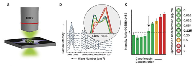 Raman spectroscopy captures the effect when light partially scatters inelastically as it interacts with matter. The amounts of energy transferred between photons and molecules during this process correspond to specific molecular vibrations. Therefore, Raman spectroscopy is ideally suited for characterizing and identifying the chemical composition of various samples because the spectra provide a “molecular fingerprint.” When highly complex samples such as microorganisms, cells, and tissue are investigated, all Raman active components — such as proteins, nucleic acids, carbohydrates, lipids, and other biomolecules — will contribute to the overall spectrum. Due to the similar constitution of various cells or tissues, the corresponding spectra will look similar and will be indistinguishable by the naked eye or through simple spectra analysis. Interference-enhanced Raman chips display various colors due to the different aluminum oxide layers, which are used to strengthen the Raman signal. Courtesy of Susanne Pahlow. Accordingly, advanced chemometric methods, or the use of statistics to reveal chemical information, are required to reveal the subtle changes within the samples. Due to the recent progress in the field of artificial intelligence, powerful algorithms are available for analyzing highly complex data sets. This progress is also reflected in the tremendous increase, by a factor of 35 within the last 10 years, in the number of related publications, according to a literature review of Raman spectroscopy for point-of-care applications. Despite these developments, Raman spectroscopy is still infrequently applied in routine analysis. What few examples exist can mainly be found in material characterization or substance identification in the pharmaceutical field. The commonality behind these applications is that the samples have a simple composition or consist of just one compound. Consequently, spectra with few and distinct bands that can be easily evaluated without the need for chemometric analysis are obtained. Due to the fact that the analyte is usually present in a high concentration and uniformly distributed within the sample, in most cases only a point spectrum is required. When it comes to the investigation of biomaterials, the situation is dramatically different. Body fluids or cells comprise a huge quantity of complex components. For example, both nucleic acids and proteins can be considered biopolymers that consist of nucleotides or amino acids. Another complication is the possible heterogeneity of biological samples. Investigation of a statistically relevant number of cells from a given population is required to ensure accuracy of the data collected. Automated solutions enable the fast and convenient measurement of a large number of cells. In other cases, the analyte may only be present in a low concentration so that the intrinsically weak Raman signal needs to be enhanced in a reliable and reproducible manner. Possible solutions include surface-enhanced, fiber-enhanced, interference-enhanced, or resonance Raman spectroscopy. Alternatively, sample preparation methods can also help improve the sensitivity. Sample preparation Sample preparation plays a critical role in the subsequent analysis, regardless of the detection method that is applied. Depending on the sample composition, it is important to enrich or purify the analyte (or do both). For Raman-based detection methods, the type of sample preparation depends on the type of the sample and the information desired. For example, urine samples can be analyzed regarding their overall content using a sum parameter approach, or, in the case of diagnosing urinary tract infections, only the present bacterial species will be of interest. In other cases, a certain biomarker may be the target analyte. Obviously, these approaches have very different requirements in terms of sample preparation. For the sum parameter approach, droplet drying of the sample on a Raman-compatible substrate can be sufficient. For diagnosing a bacterial infection, usually steps involving enrichment and washing of the cells via filtration, centrifugation, or a chip-based method are necessary. In case of the biomarker, whether an enrichment procedure is required or not depends on the concentration range. In Raman microspectroscopy, where the sample is investigated using the combination of a microscope and a Raman spectrometer, chip-based sample preparation methods enable the ability to perform the isolation or enrichment on the same platform as the Raman measurement itself. However, developing corresponding chips that include a microfluidic setup is a complex task. During the fabrication of the chip substrates, multiple surface modification procedures are often applied. Usually, a chemical surface activation — for example, via silanization — is first carried out to create reactive groups on the chip surface. Silanization is the covering of a surface with organofunctional alkoxysilane molecules. As a basic material for a Raman compatible chip, aluminum will not interfere with the spectra of the analytes. Unfortunately, the direct detection of thin layers on plain aluminum using Raman spectroscopy is not possible in most cases because the Raman signal will be too weak. To enhance the signal, an aluminum surface was combined with an aluminum oxide (Al2O3) layer of defined thickness1. By tuning the thickness of the aluminum oxide, the Raman signal can either be enhanced or weakened due to constructive or destructive interference of lightwaves (interference-enhanced Raman spectroscopy, or IERS). Compared to surface-enhanced Raman spectroscopy (SERS), in which the enhancement factors are several orders of magnitude higher, the signal increase — from 101 to 102 — is relatively modest. However, the interference-based mechanism has advantages over SERS, such as the homogenous enhancement over the entire surface area, uncomplicated and cost-efficient productio