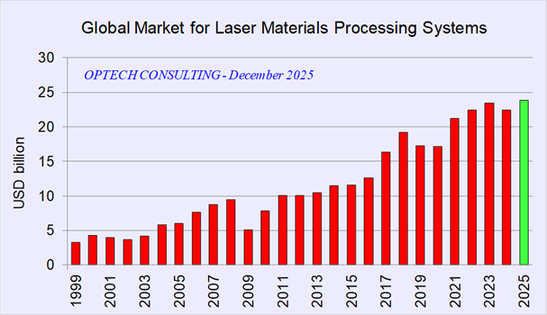 Figure 1. The global market for laser material processing systems marks a new all-time high in 2025. Courtesy of Optech Consulting.