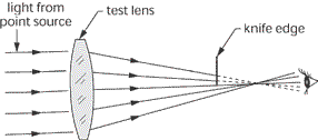 The Foucault test is performed by moving a knife edge laterally into the image of a small point source. The eye, or a camera, is placed immediately behind the knife edge, and the exit pupil of the system is observed.