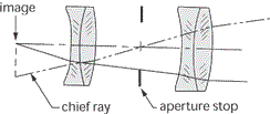 The ray that passes through the center of the aperture stop in an optical system. It often is called the principal ray of an oblique beam.