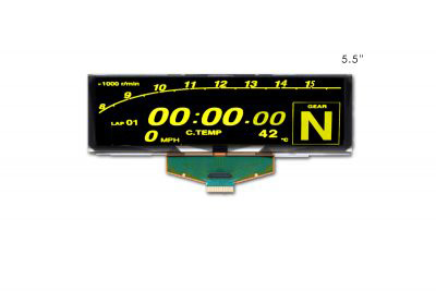 The 5.5 in. 256 × 64 Hyperfluorescence™ PMOLED display from WiseChip Semiconductor uses Kyulux’s Hyperfluorescence OLED technology. The Hyperfluorescence stack doubles the brightness while consuming the same power, compared to WiseChip’s standard OLED device.